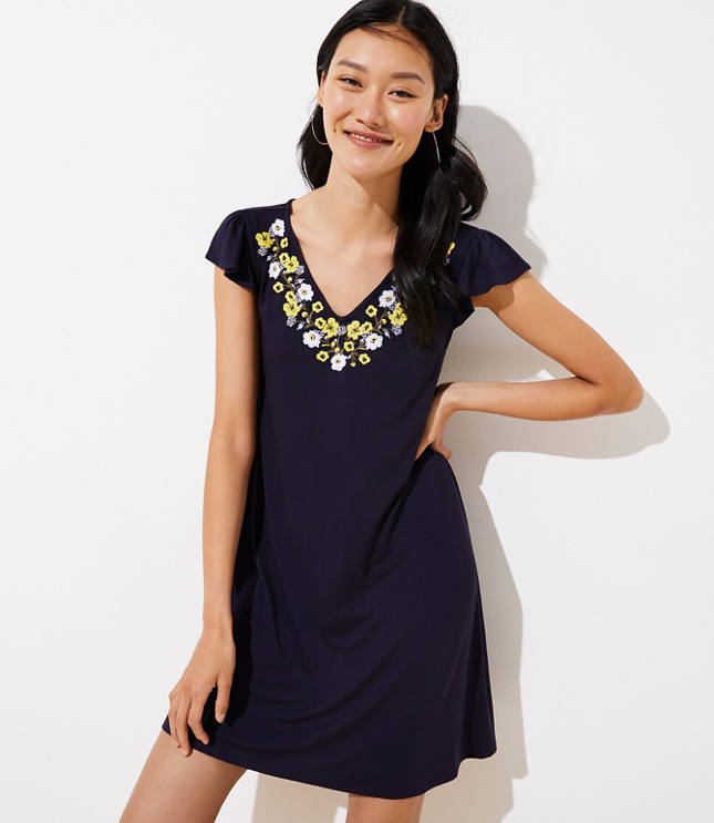 I wasn't sure how I would like the bright pop of yellow embroidered flowers on this dress, but I decided to give it a try anyway. I liked the idea of a jersey-material for the swing dress. When this dress arrived, it was pretty low-cut, so I paired it with a black tank, which is how I'll continue to wear it. The V-neck also is reflected in the back of the dress, so the tank helps add in some layering there too. Overall, this dress is very lightweight and a good addition to my work wardrobe!